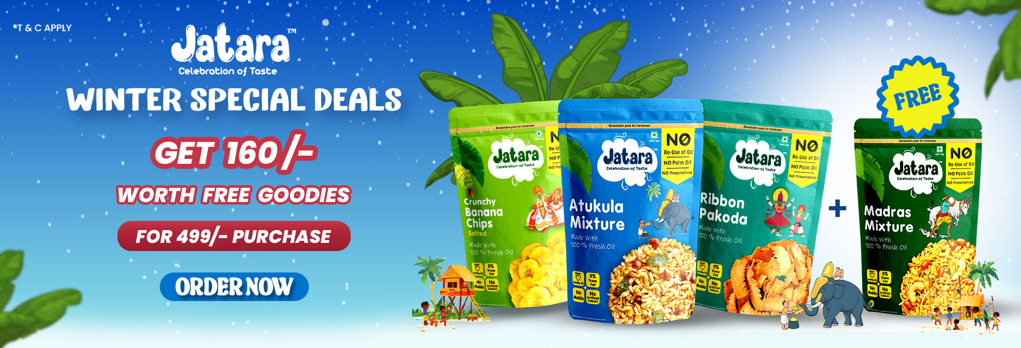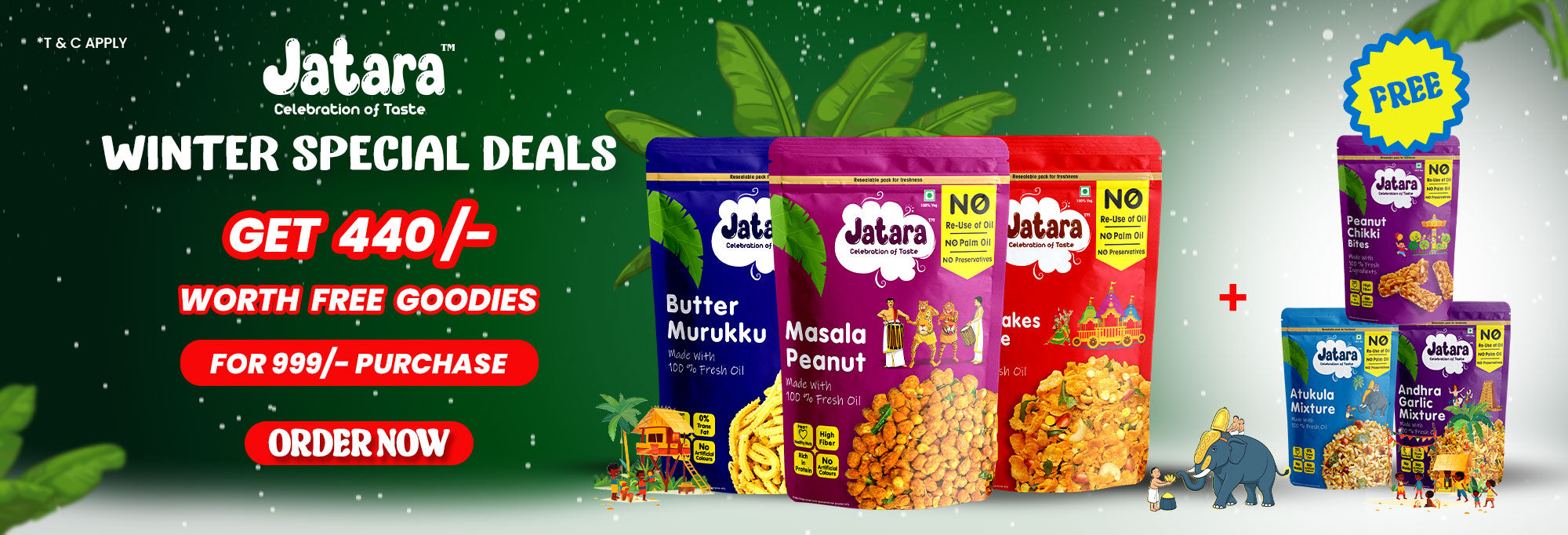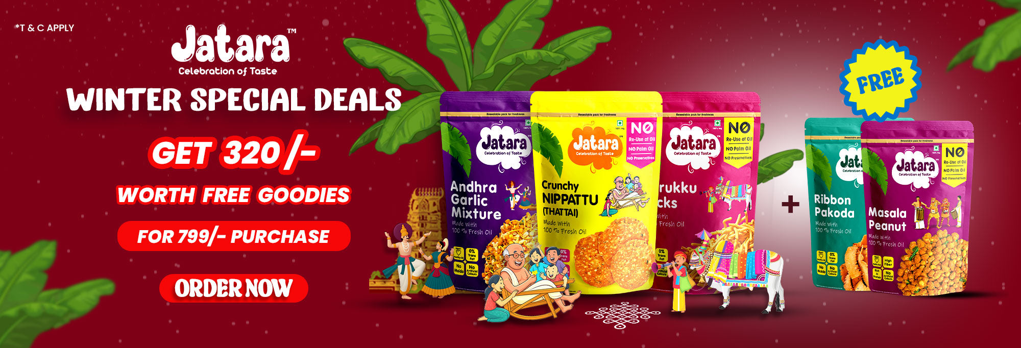 A celebration of South Indian flavours — no Palm Oil, no Preservatives, no Maida. Just joyful, guilt-free snacking, made the Jatara way.