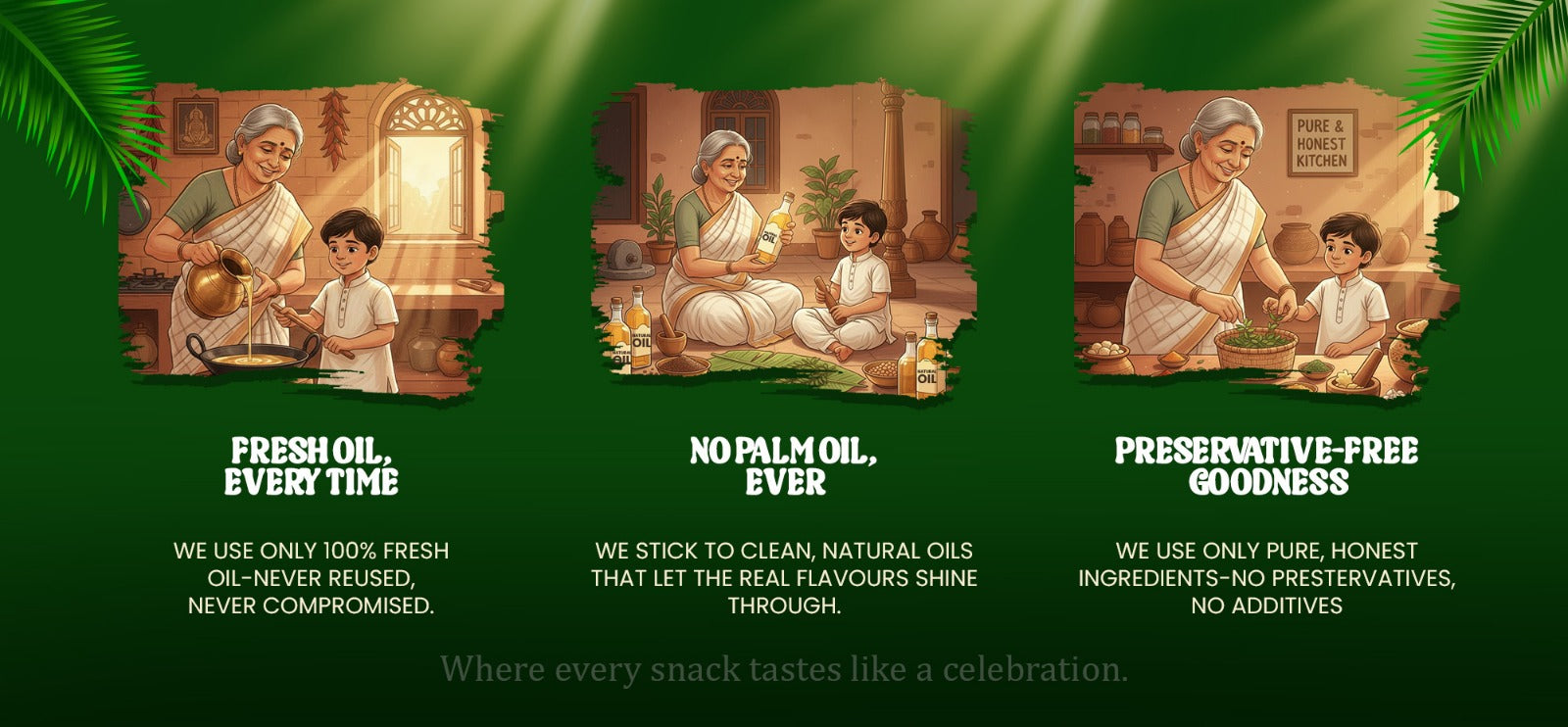 Palm oil has environmental and health concerns. By avoiding palm oil, we protect ecosystems, reduce saturated fat intake, and support sustainable sourcing. All our snacks are cooked in fresh, clean oil, giving you authentic taste without compromise.